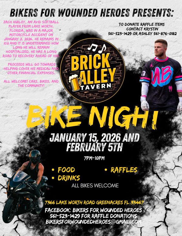 Zach Hurley was seriously injured in a motorcycle accident on January 2nd. He is currently still in ICU and will remain hospitalized for an undetermined amount of time. We will be at Brick Alley Tavern in Greenacres on January 15, 2026 and February 5, 2026 fundraising for his medical expenses.